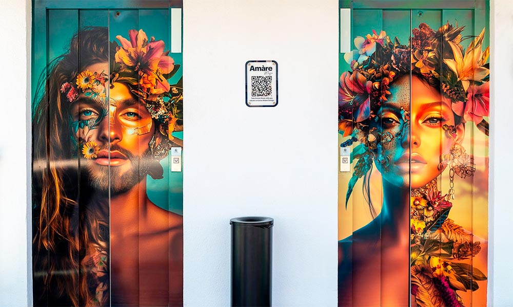 La identidad y el predominio del blanco en la arquitectura y la decoración de Amàre Hotels crean el contexto perfecto para que la explosión de color saturado de mi obra destaque y tenga una presencia muy clara dentro del espacio. Ese fondo neutro permite que la obra respire y cobre protagonismo, algo que muchas veces no ocurre en lugares con demasiada información visual.