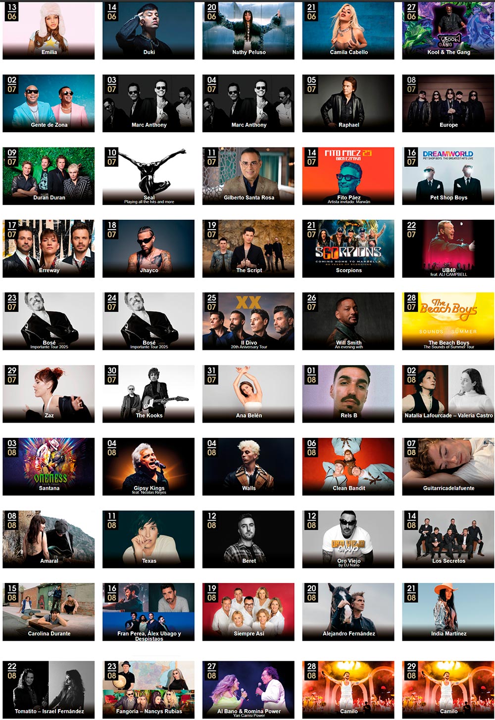 El ciclo de conciertos de Starlite Marbella 2025, en su decimotercera edición, presenta en su cartel a artistas como Nathy Peluso, Marc Anthony, Duran Duran, Melendi, Amaral y Seal, entre otros. Las entradas están disponibles para su compra a través de la página web oficial.
